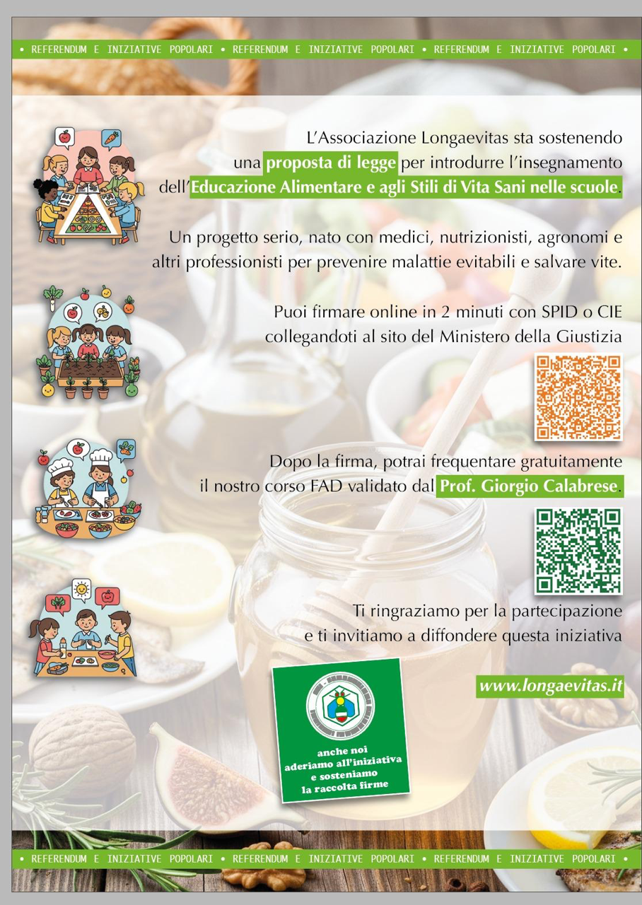 Proposta di legge di iniziativa popolare - iniziativa annunciata nella Gazzetta Ufficiale n. 111 del 15 maggio 2025 - "Introduzione dell'insegnamento dell'educazione alimentare, ambientale e agli stili di vita sani nelle scuole, enti di istruzione e formazione di Forze Armate, Forze di Polizia e di pubblico soccorso."