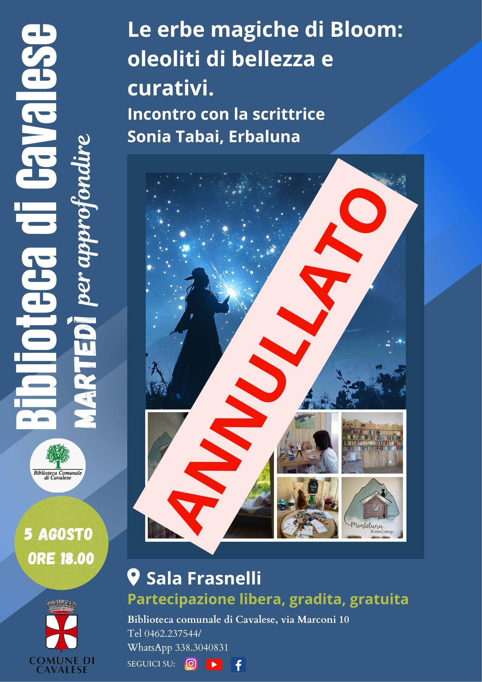 Contatti Telefono: (+39) 0462 237544 E-mail: biblioteca@comunecavalese.it Fax: (+39) 0462 237550 Cellulare - Whatsapp: (+39) 338 3040831 Orario Biblioteca LunChiuso, ChiusoMar09:30 - 12:00 , 14:30 - 18:00MerChiuso, 14:30 - 18:00Gio09:30 - 12:00 , 14:30 - 18:00Ven09:30 - 12:00 , 14:30 - 18:00Sab09:30 - 12:00 , Chiuso Valido dal 01/08/2023