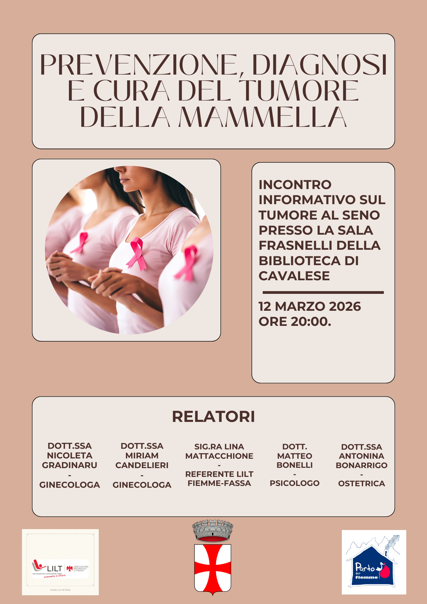 Cos'è Relatori: Nicoleta Gradinaru, Miriam Candelieri, Lina Mattacchione, Matteo Bonelli, Antonina Bonarrigo.Incontro promosso da LILT Fiemme-Fassa, Comune di Cavalese e Parto per Fiemme.