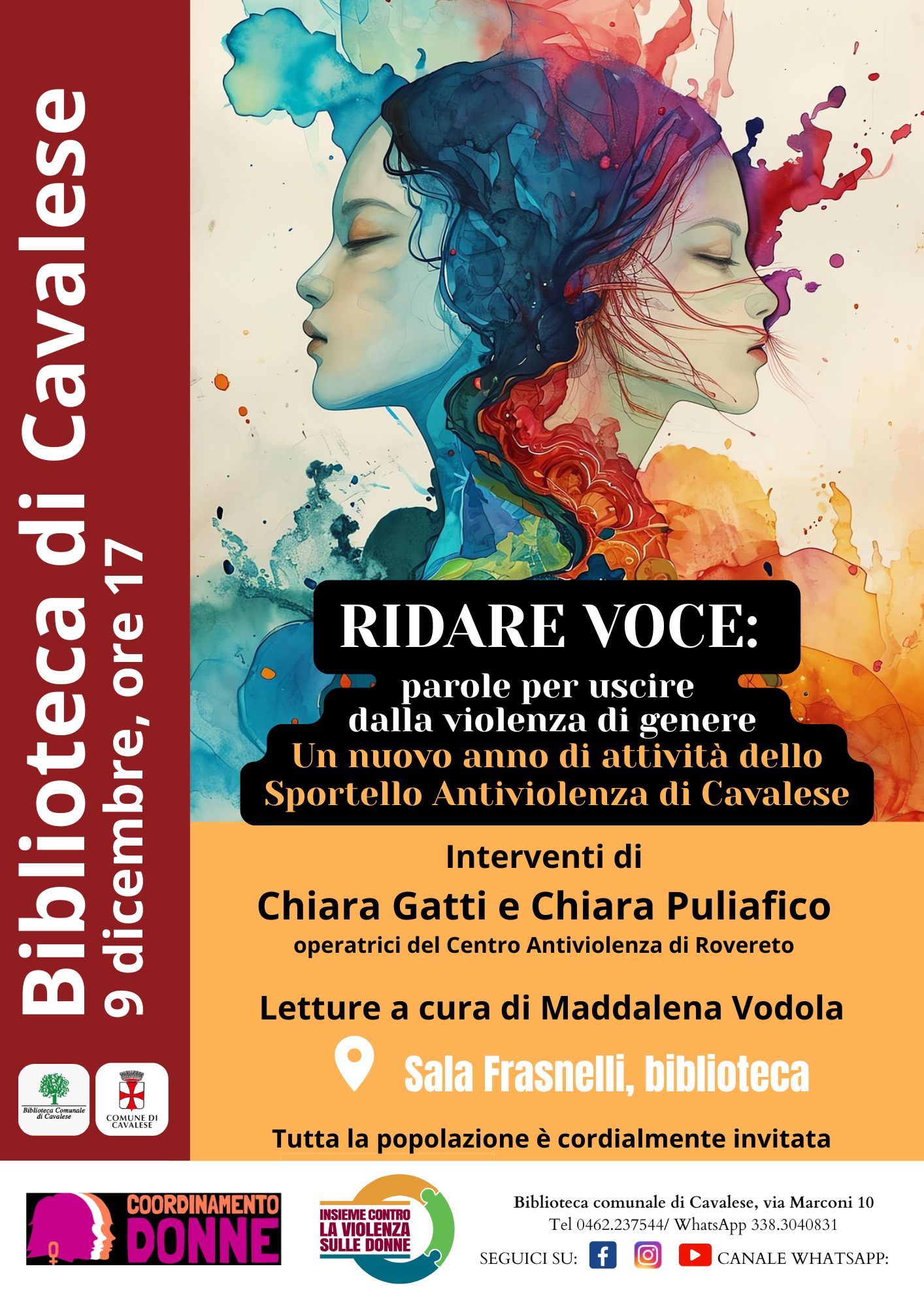 Interventi di Chiara Gatti e Chiara Puliafico, operatrici del Centro Antiviolenza di Rovereto; letture a cura di Maddalena Vodola; con la partecipazione dell’artista Elena Corradini che, con una fotografia artistica che verrà esposta in biblioteca, propone un messaggio di amore, pace e rispetto per tutte le donne e per tutte le loro diversità.