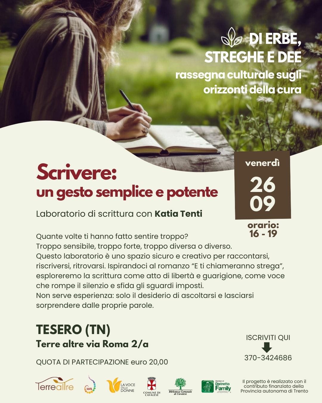 Quante volte ti hanno fatto sentire troppo? Troppo sensibile, troppo forte, troppo diversa o diverso. Questo laboratorio è uno spazio sicuro e creativo dedicato a tutte le persone che sentono il bisogno di raccontarsi, riscriversi, ritrovarsi. A partire dalle suggestioni del romanzo E ti chiameranno strega, esploreremo la scrittura come atto di libertà e guarigione, come voce che rompe il silenzio e sfida gli sguardi imposti. Ci muoveremo nel mondo della scrittura creativa, con esercizi pensati per riscoprire la propria voce e dare vita a personaggi ribelli, imperfetti e autentici. Concluderemo con uno spazio di condivisione (facoltativa), per chi vorrà leggere ad alta voce e trasformare la scrittura in un dialogo collettivo di ascolto, empatia e scoperta. Non serve esperienza: solo il desiderio di ascoltarsi e lasciarsi sorprendere dalle proprie parole.